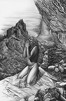 "Prayer" began as yet another study (see others in Sketchbook II) for the painting presently in progress. Then... through the sketching stage I felt the figure was worthy of more thorough study and began working on the detailed pencil drawing. Initially what I had in mind was to simply do the figure without a background, as I had done in drawings such as "Samsara" and "Within Skin and Stone", but "Prayer" grew. It expanded to the point where most of the 20" x 30" piece of art board would be covered in graphite. Not since I finished the painting "Enlightenment" in 2000, had I integrated the Sedona red rock formations into a piece. Now I would revisit them, only this time in graphite, and draw them for the first time in black and white. Never having drawn the rocks before, I found myself less interested in reproducing them exactly. Instead, I allowed the rocks and my own subconscious to speak through my hand, producing often times strange and unusual shapes and forms. Although through painting these incredible sand stone formations a certain style was developing. In drawing them for the first time, this process evolved to the point where I glanced at the source material less and less. Omitting color and reducing the image to light and shadow had a liberating effect. Liberating not only in style but also in content and composition. For example; the back and foreground setting is a combination of two separate locations. In the distance is the rock formation known as Shiprock, located in the Northwestern corner of New Mexico. Shiprock is a formation I have viewed from a distance numerous times and as I recall... at least once, while traveling down the infamous 666 highway heading South towards Gallup and Interstate 40. Interstate 40 would eventually lead us to our preordained destination, Sedona Arizona. And just outside Sedona and the rangers reach was where we found our temporary home, beneath the towering rock face of a place called Loy Butte. It was in climbing and exploring the rock face where we came across the old Indian ruin, situated high on a cliff under which we slept many a night. This location along with Shiprock looming in the distance conjoined creating the setting for "Prayer". Every so often a painting or drawing brings in it's wake a period of fundamental change and "Prayer" (although unknown in the initial stages) would prove to be one such piece. Personally and artistically this drawing ushered in a welcome change of direction. Although not prominent within this piece itself (short of some areas where I experimented) the change will profoundly effect the course of the painting presently in progress. Many of the sketches (see Sketchbook II) will now be left behind and with the vision clear, the painting which has been in the planning stages for quite some time will now receive my full artistic devotion. The execution of "Prayer" has spanned approximately a two year period of my life. When signing it I was a little disheartened to noticed that throughout 2002 I had not signed a painting or drawing. It was not that the actual work involved in producing the piece should have required this length of time. There were many days if not weeks and months that went by where I couldn't even look at it. At times I wondered if I had lost my passion and desire to produce any works of art ever again. I don't know about other artists but this old demon comes knocking at my door more often than I care to mention. But then... looking back over 2002 there were numerous distractions to account for my artistic neglect. The most relevant, personal family health challenges that although I will not go into have been met and vanquished. So it would seem that there was plenty to pray for in 2001- 02. Not only within my personal experience but also on a global level. At times I wonder if the human race has simply gone off the deep end. In a world where a tragic event could be politically hijacked and morphed to justify the massive ordinance dropped on Baghdad, I find it increasingly more difficult to find my place. All I know is, when I watched the bombs ignite in apocalyptic fire balls over Baghdad, September 11 became just another day in a world gone completely mad. And that is quite possibly the saddest statement I have ever made. Yes... there is no shortage of things to pray for these days. The world my daughter will inherit, peace on earth, humanity, the animals, the environment, personal health, truth... just to mention a few. But in the end and during the final pencil strokes and smudges "Prayer" answered a long held prayer of my own. The reemergence of a passion I thought was long dead but which turned out to be simply sleeping. The passion which fuels the desire to create something beautiful. I was a little surprised at where I found it.